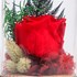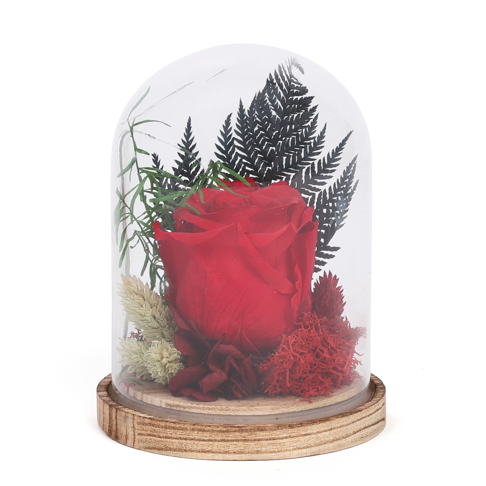 - La cloche de verre protège cette élégante rose stabilisée, installée au cœur d'une composition végétale.