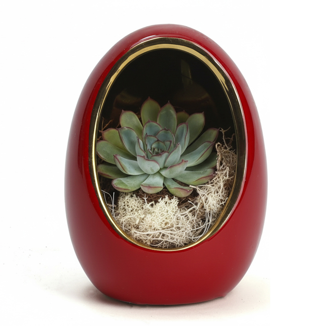 - Cette petite succulente s’installe dans un pot original en forme d’œuf.