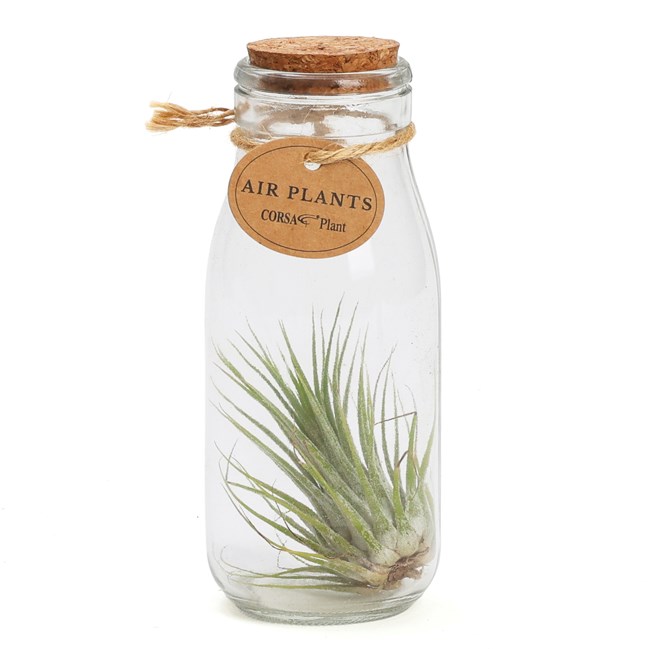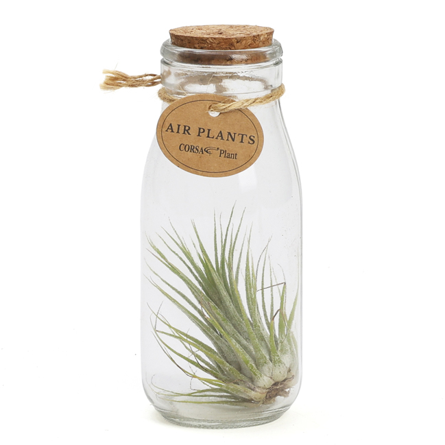- Dans ce tube en verre scellé par un bouchon de liège, une Tillandsia, aussi appelée fille de l’air, se développe sans terre ni racines.