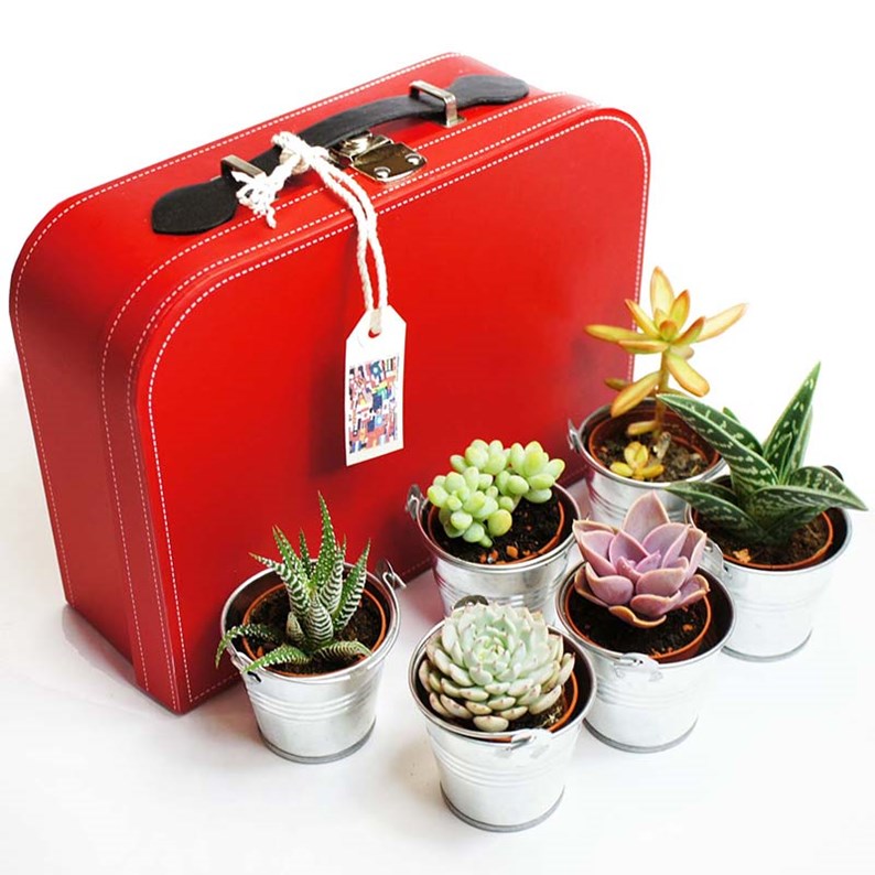 Jolie valise aéropostale en carton contenant un panaché de plantes grasses originaires du Mexique, Afrique du Sud, Canaries, Madagascar, etc..., accompagnées de leur seau zinc. Les plantes sont sélectionnées en pépinière par nos soins en fonction des disponibilités du moment.