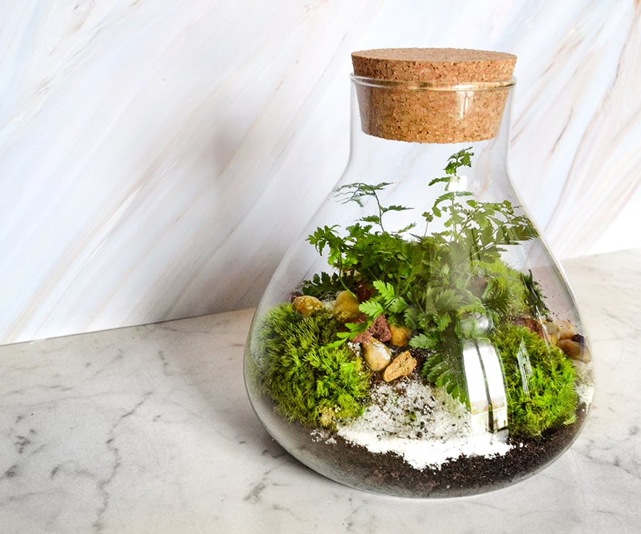 Placez votre terrarium dans un endroit lumineux mais pas en contact direct avec le soleil. À arroser seulement tous les 4 à 6 mois