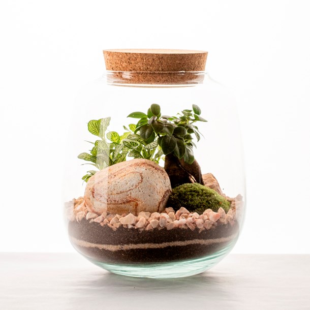 - Le terrarium Moly se compose d'un élégant bocal en verre fermé par un bouchon en liège.