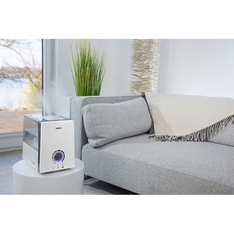 Humidificateur d'air avec 3 niveaux de chauffage de l'eau activables et plaquettes anti-calcaire jusqu'à 48 m² L'air du chauffage ne doit pas être trop sec : cet humidificateur d'air avec technologie dhumidification par ultrasons vous assure une humidité relative optimale. Nébulisation ultrasonique avec chauffage de leau Humidification élevée avec technologie dhumidification par ultrasons Nébuliseur à ultrasons réglable en continu 3 niveaux de réglage du chauffage de leau Fonctionnement silencieux Vapeur deau hygiénique Réservoir amovible avec affichage du niveau deau Interrupteur rotatif lumineux Arrêt automatique avec fonction daffichage Avec 15 plaquettes anticalcaire contre un entartrage trop rapide et 15 coussinets aromatiques pour une utilisation avec des arômes