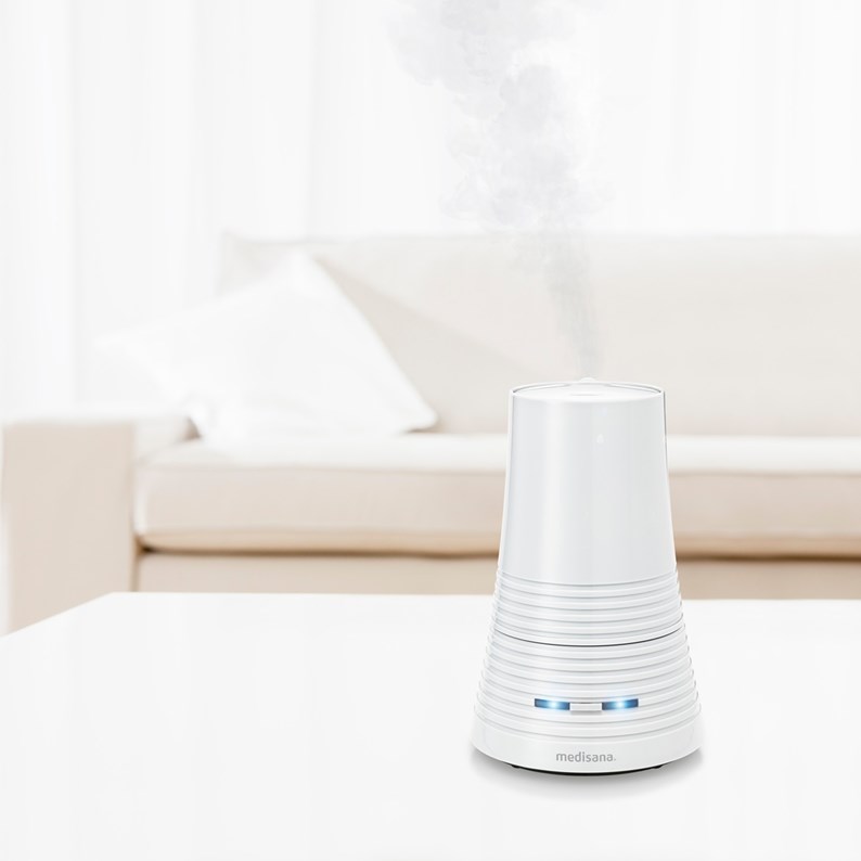 L'humidificateur d'air vous aide à créer un climat intérieur sain chez vous. Un air ambiant trop sec augmente la sensibilité aux maladies infectieuses et respiratoires et peut entraîner de la fatigue ou même des difficultés de concentration. Grâce à la technologie des ultrasons, l'humidité est micro-pulvérisée. La saturation de l'air ambiant en eau peut en outre être réglée en continu. Résultat : les muqueuses sont protégées contre le dessèchement et les yeux et les voies respiratoires sont moins irrités.