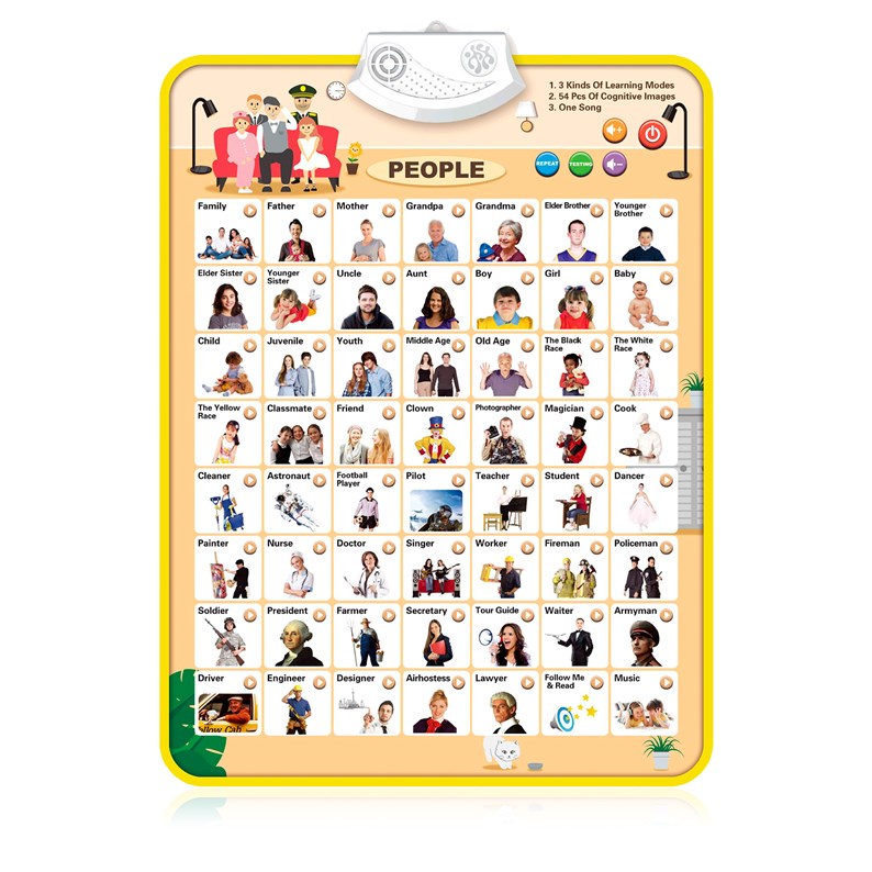 Alphabet électronique interactif pour apprendre l'anglais : • Jouet éducatif pour le développement de la petite enfance. L'affiche d'apprentissage interactif sur les personnes, les personnages et les professions est un excellent choix pour que les jeunes enfants apprennent l'anglais, l'association de mots et d'images. • L'affiche aide vos garçons et filles à apprendre les noms de personnes, de personnages et de professions en anglais, à chanter et à danser sur des chansons populaires pour enfants et à développer de nouvelles compétences nécessaires pour la maternelle et au-delà. • Gardez votre enfant occupé et réduisez le temps passé devant un écran ; Les boutons sont faciles à appuyer. Le contrôle du volume permet une certaine tranquillité. C'est un jouet éducatif parfait pour les enfants âgés de 1 à 3 ans. • Le design attrayant et coloré attirera et offrira des heures d'exploration et d'apprentissage amusantes à votre tout-petit. Parfait pour accrocher en continu au mur de votre pièce ; Il est également très facile à nettoyer. • S'éteint automatiquement pour préserver la durée de vie de la batterie. Le dos et les côtés du produit sont enveloppés d'un tissu imperméable. Les matériaux utilisés sont sans danger pour les plus petits de la maison.