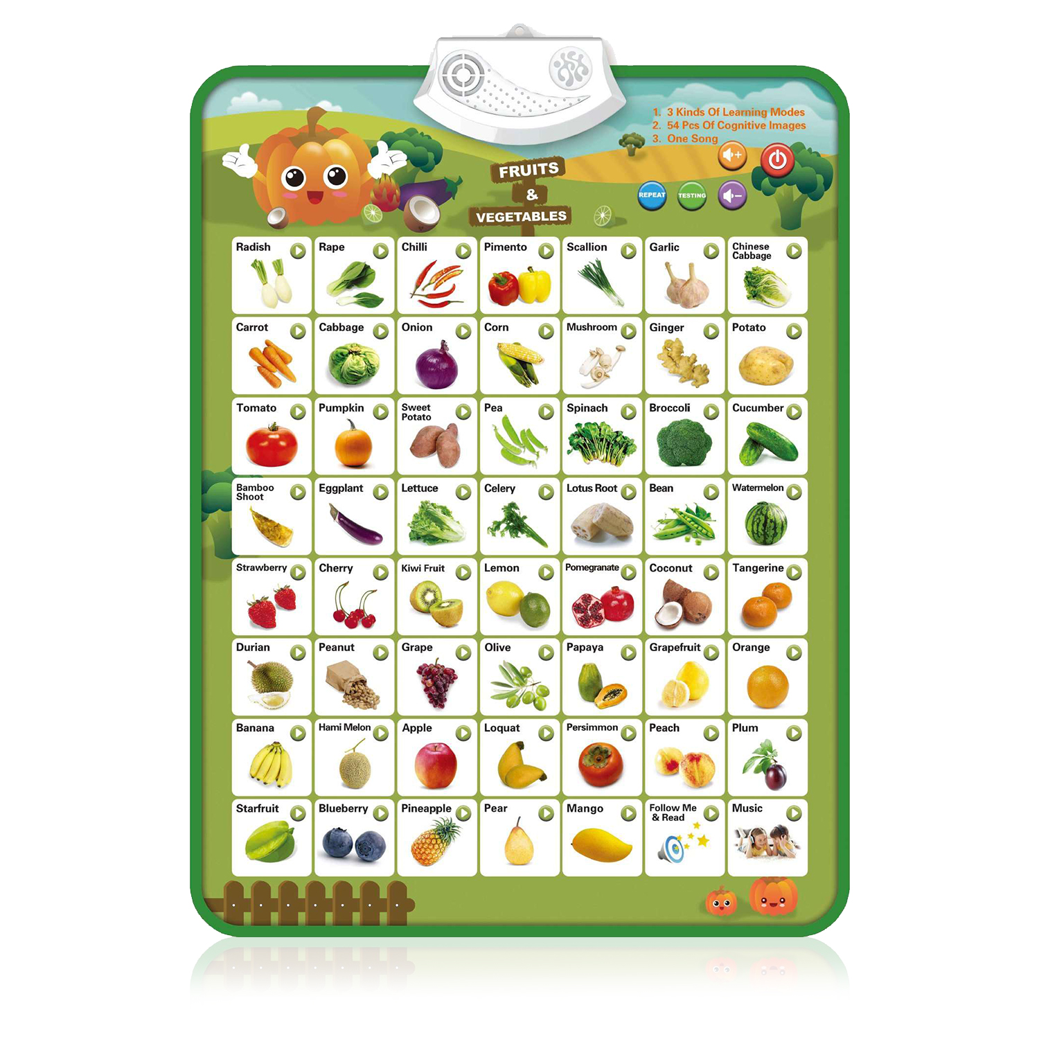 Alphabet électronique interactif pour apprendre l'anglais : • Jouet éducatif pour le développement de la petite enfance. L'affiche interactive d'apprentissage des fruits et légumes est un excellent choix pour que les tout-petits apprennent l'anglais, l'association de mots et d'images. • L'affiche aide vos garçons et filles à apprendre les noms des fruits et légumes en anglais, à chanter et à danser sur des comptines populaires et à développer de nouvelles compétences nécessaires pour la maternelle et au-delà. • Gardez votre enfant occupé et réduisez le temps passé devant un écran ; Les boutons sont faciles à appuyer. Le contrôle du volume permet une certaine tranquillité. C'est un jouet éducatif parfait pour les enfants âgés de 1 à 3 ans. • Le design attrayant et coloré attirera et offrira des heures d'exploration et d'apprentissage amusantes à votre tout-petit. Parfait pour accrocher en continu au mur de votre pièce ; Il est également très facile à nettoyer. • S'éteint automatiquement pour préserver la durée de vie de la batterie. Le dos et les côtés du produit sont enveloppés d'un tissu imperméable. Les matériaux utilisés sont sans danger pour les plus petits de la maison.
