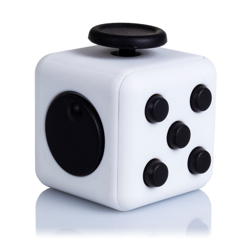 Fidget Cube anti-stress à 6 faces, dont chacune possède un élément relaxant : La première face dispose de 5 boutons pour satisfaire le besoin d'appuyer sur le stylo. Le deuxième côté est doté d'un disque rotatif. Le troisième côté a un interrupteur qui peut être constamment « allumé et éteint ». Le quatrième côté a trois engrenages et une boule qui peut tourner en continu. Le cinquième côté a un joystick. La dernière face s'inspire de la traditionnelle « pierre à soucis » qui réduit l'anxiété au toucher grâce à son toucher agréable.