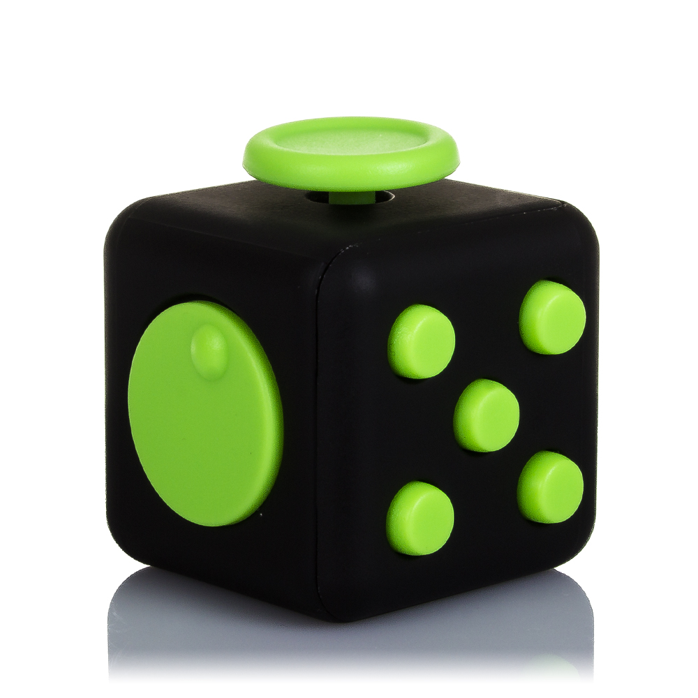 Fidget Cube anti-stress à 6 faces, dont chacune possède un élément relaxant : La première face dispose de 5 boutons pour satisfaire le besoin d'appuyer sur le stylo. Le deuxième côté est doté d'un disque rotatif. Le troisième côté a un interrupteur qui peut être constamment « allumé et éteint ». Le quatrième côté a trois engrenages et une boule qui peut tourner en continu. Le cinquième côté a un joystick. La dernière face s'inspire de la traditionnelle « pierre à soucis » qui réduit l'anxiété au toucher grâce à son toucher agréable.