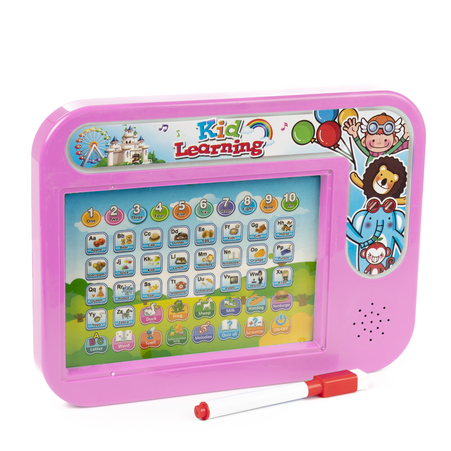 Machine d'apprentissage de l'anglais avec sons, contient : • Tableau noir au dos de la machine avec marqueur • Test pour calculer le niveau d'anglais en chiffres et en lettres • Apprentissage didactique avec exemples • Sélectionnez le bouton et avec des sons il vous dit et épelle • Apprentissage bouton pour épeler • Mélodies