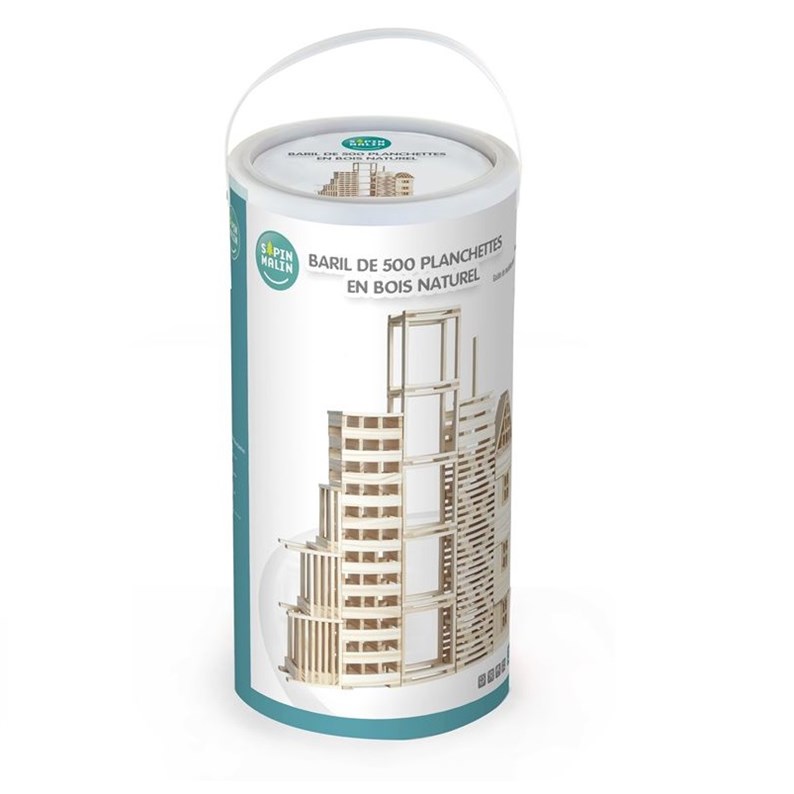 Un baril de 500 planchettes en bois pour de grandes constructions de la marque Sapin Malin.Cet article ne convient pas aux enfants de moins de 3 ans.Age minimum recommandé : 3 ansAge maximum recommandé : 12 ans