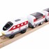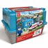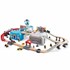 qui rend le rangement et le transport particulièrement faciles. Dans ce set, même la boîte de rangement sont reliées entre elles par un pont et des rails. Le set se compose de différents éléments de rails en bois et de wagons, d'une locomotive avec des remorques, de différents éléments de paysage, de panneaux de signalisation, conducteur de train, taxi, grue, aéroport, avion et de nombreuses autres pièces.