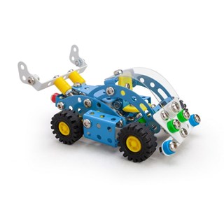 Un jeu de construction intemporel fabriqué en métal chromé, avec des pièces en plastique colorées, dont l'assemblage se fait au moyen de vis et d'écrous. 100% fabriqué en Europe.
