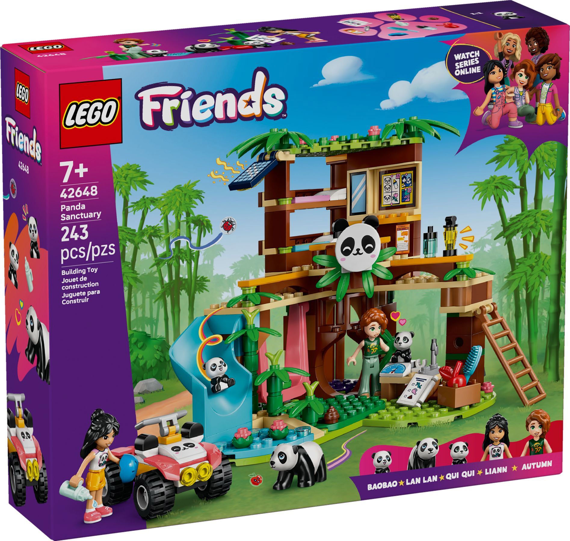Les enfants imaginent des histoires avec Autumn et Liann qui s'occupent d'un sanctuaire pour pandas. Le modèle comprend de nombreux accessoires, dont une balance et des outils de toilettage, mais aussi des détails amusants. Les pandas dévalent le toboggan et tombent dans l'eau ou se balancent. Le 4x4 est parfait pour transporter le bambou dont les pandas raffolent. Lorsque les pandas vont dormir dans leur grotte, les amies grimpent l'échelle de la cabane dans l'arbre, équipée d'un bureau et de 2 lits. Le set explore le thème de l'amitié et stimule le développement social à travers le jeu d'imitation.
