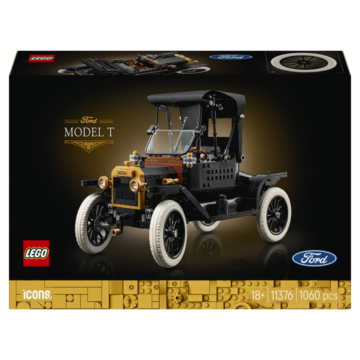 . KIT DE VOITURE VINTAGE À PARTIR DE 18 ANS ? Embarquez pour un voyage nostalgique avec la Ford Model T LEGO® Icons (11376), une maquette de voiture très détaillée pour les adultes. MODÈLE DE VOITURE VINTAGE ? Recréez la voiture légendaire des années 1910 avec sa carrosserie noire étincelante rehaussée de détails dorés, une capote en tissu repliable et de hautes jantes à rayons avec pneus fins en caoutchouc blanc. FORD MODEL T DÉTAILLÉE ? Repliez la capote et rabattez le pare-brise en deux parties, soulevez les deux panneaux du capot pour voir le moteur, faites tourner la manivelle pour actionner le ventilateur et soulevez le siège pour accéder au réservoir. UNE DÉCORATION AU CHARME CLASSIQUE ? Cette réplique de voiture vintage à exposer constitue une élégante décoration pour la maison ou le bureau. UN SUPERBE CADEAU POUR LES PASSIONNÉS D'AUTOMOBILE ? Fêtez un anniversaire, les fêtes ou une occasion spéciale en offrant cette maquette de voiture ancienne à construire, un cadeau idéal pour les passionnés de voitures américaines anciennes. INSTRUCTIONS DE MONTAGE EN 3D ? Savourez pleinement la construction de cette voiture avec l'application LEGO® Builder, où vous pouvez visualiser votre modèle en 3D pendant la construction, suivre votre progression et explorer d'autres sets. PROJETS CRÉATIFS POUR ADULTES ? Le set de construction Ford Model T LEGO® Icons fait partie d'une gamme inspirante de projets LEGO créatifs (vendus séparément), conçus spécialement pour les adultes. DIMENSIONS ? La réplique LEGO® Icons de la Ford Model T composée de 1 060 pièces mesure plus de 20 cm de haut, 29 cm de long et 13 cm de large