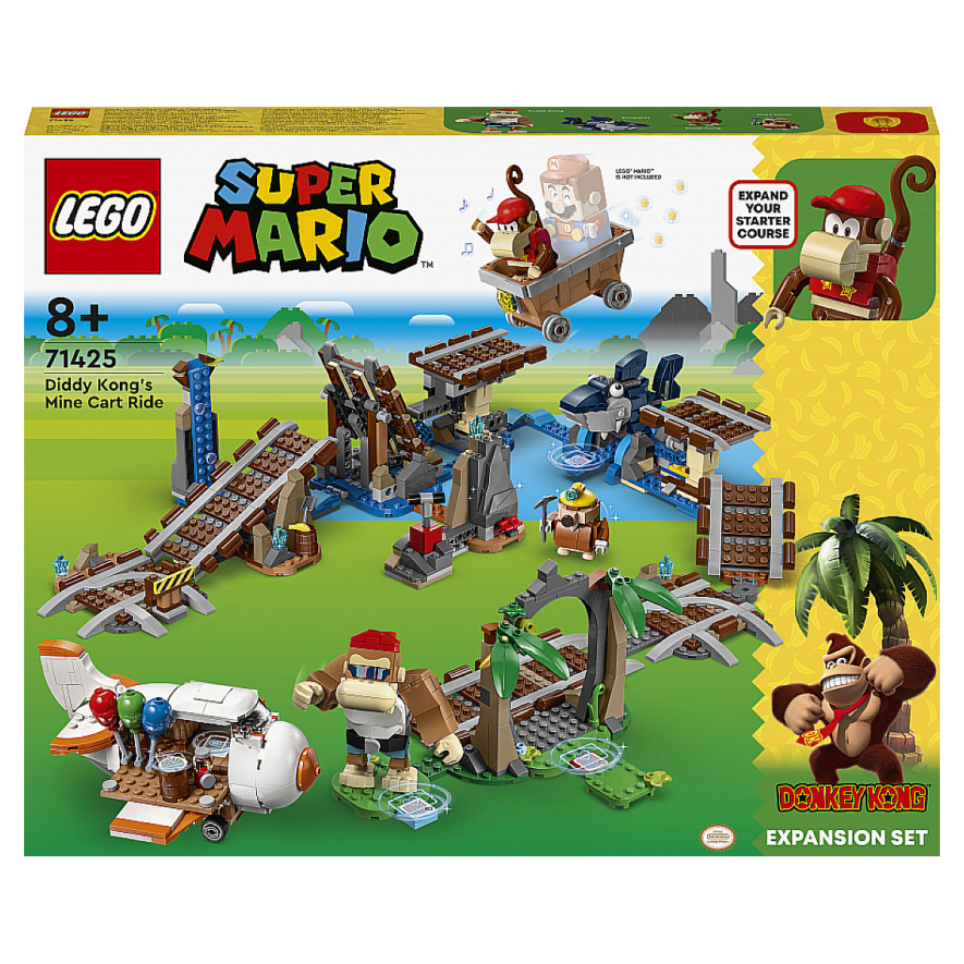Créez un niveau Donkey Kong? culte dans l'univers de LEGO® Super Mario? avec l'Ensemble d'extension Course de chariot de mine de Diddy Kong (71425). Placez LEGO® Mario?, LEGO® Luigi? ou LEGO® Peach? (personnages non inclus) dans le chariot de mine et filez sur les rails. Renversez le Squalus, réparez les rails, terrassez la Taupe minière et « pulvérisez » le rocher pour découvrir des bananes à « manger » ou à offrir à Funky Kong et Diddy Kong. Achetez des ballons au stand et faites « voler » l'avion pour gagner plus de pièces. Remarque : un Pack de démarrage 71360, 71387 ou 71403 est requis pour le jeu interactif. Construction assistée par application. Téléchargez l'application LEGO Super Mario pour des instructions de montage et des contenus inspirants qui enrichissent l'expérience créative. Reconstruire et combiner. Superbe cadeau pour les enfants dès 8 ans et les fans de Donkey Kong, ce set peut être transformé et combiné avec d'autres sets LEGO Super Mario pour créer des niveaux uniques.