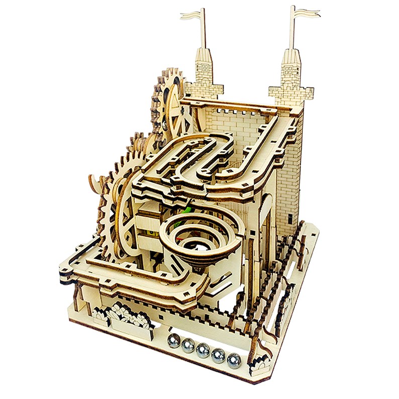 Maquette en bois 3d, avec mouvement mécanique design boules de château.