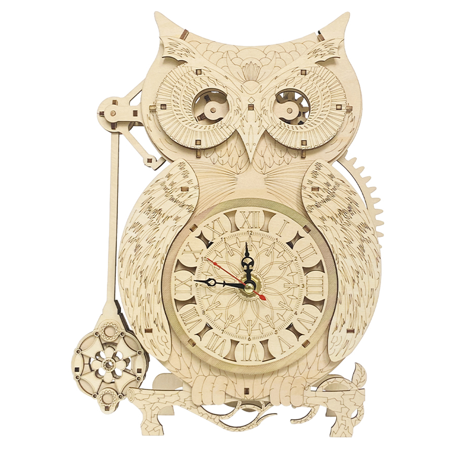 Maquette en bois 3d, avec mouvement mécanique design de horloge hibou.