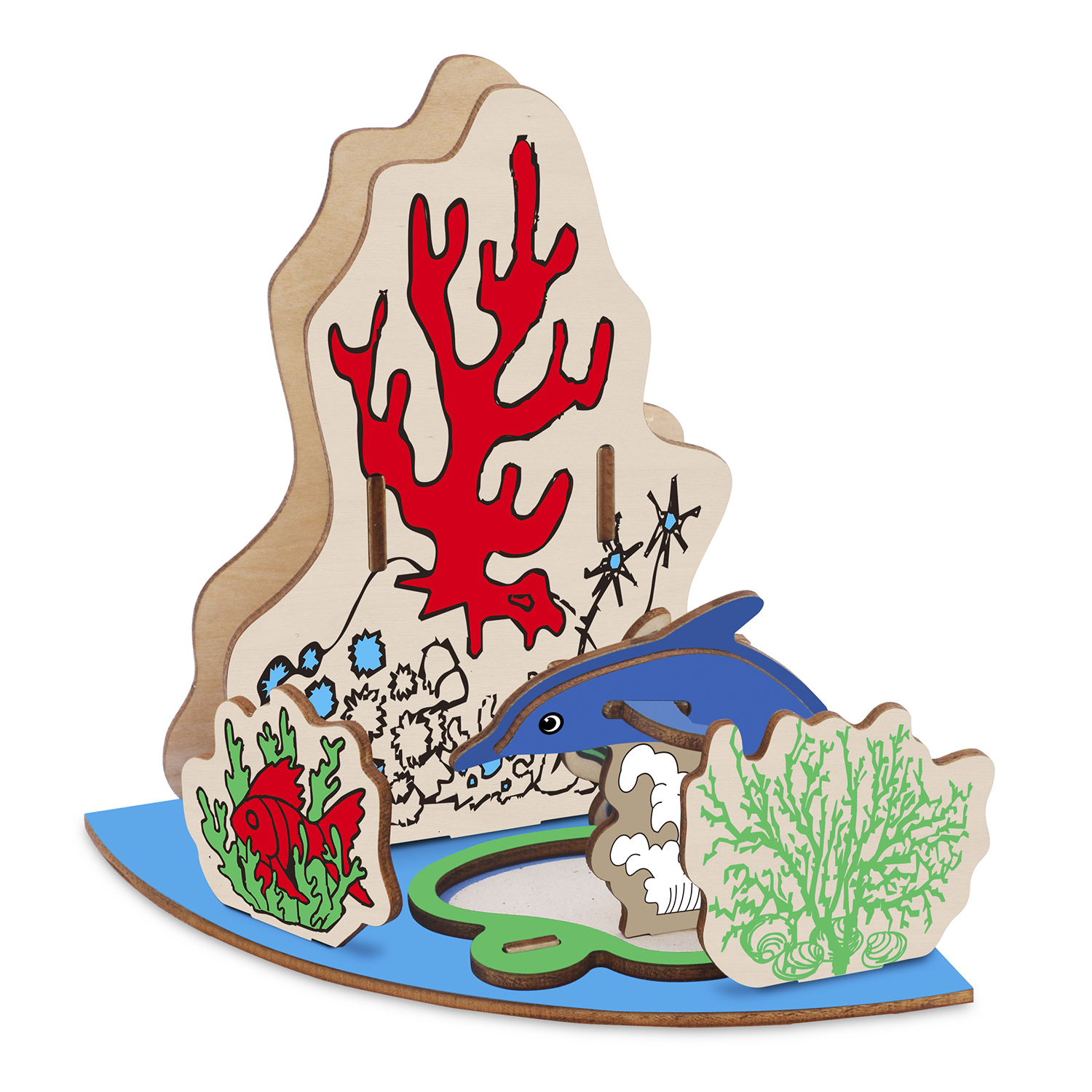 Puzzle 3D en bois Parc Marin - Dauphins. • Il comporte 22 pièces. • Niveau de difficulté : 2 sur 7. • Recommandé à partir de 8 ans.