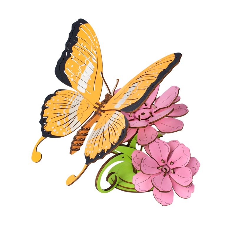 Puzzle 3d en bois. Papillon posé sur des fleurs. 80 pièces.