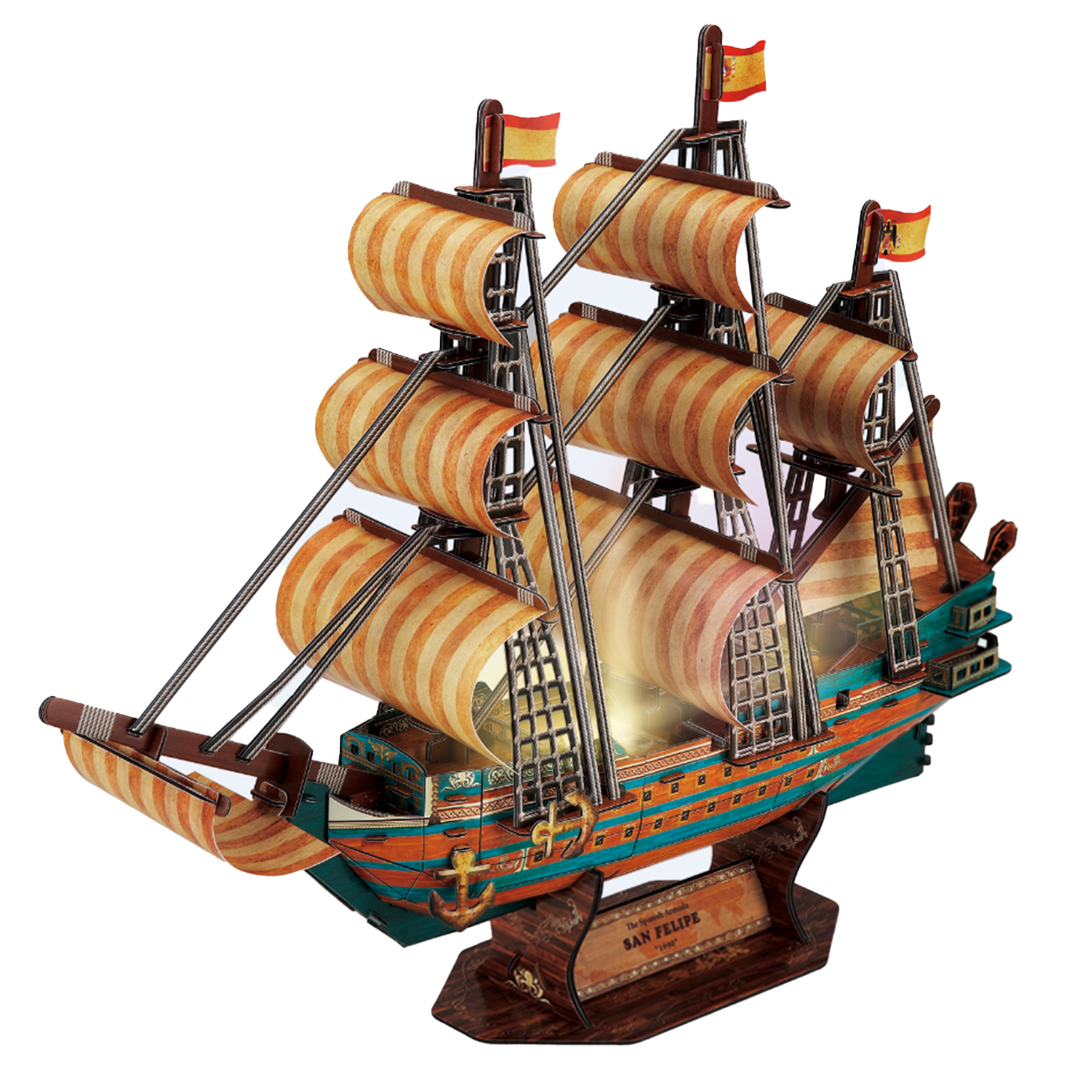 Puzzle 3D Navire de la marine espagnole SAN FELIPE avec lumières LED. • Il contient 146 pièces. • Niveau de difficulté : 4 sur 5. • Contient des lumières LED.