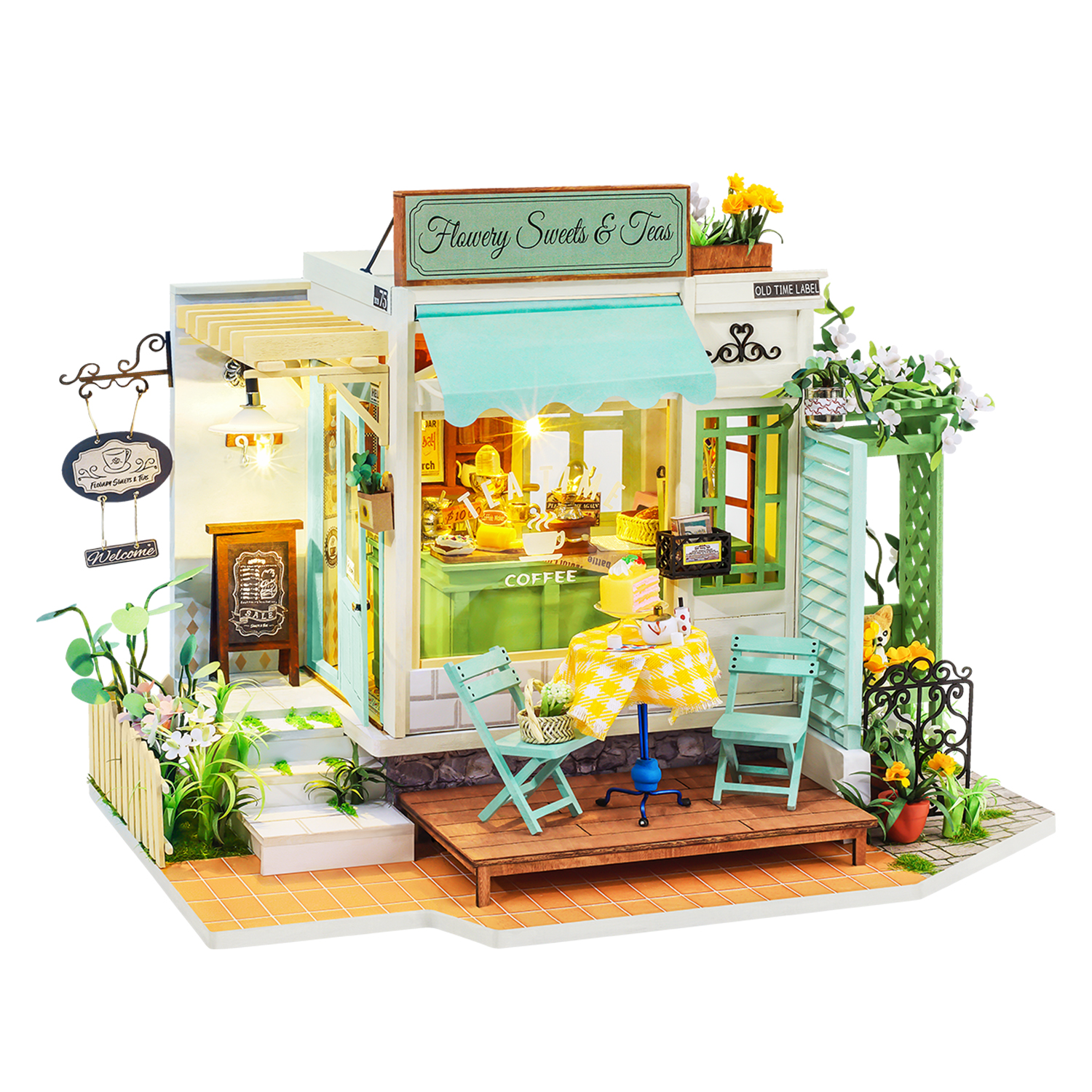 Thés et douceurs florales. Maquette en bois de maison de poupées à peindre.  En savoir plus