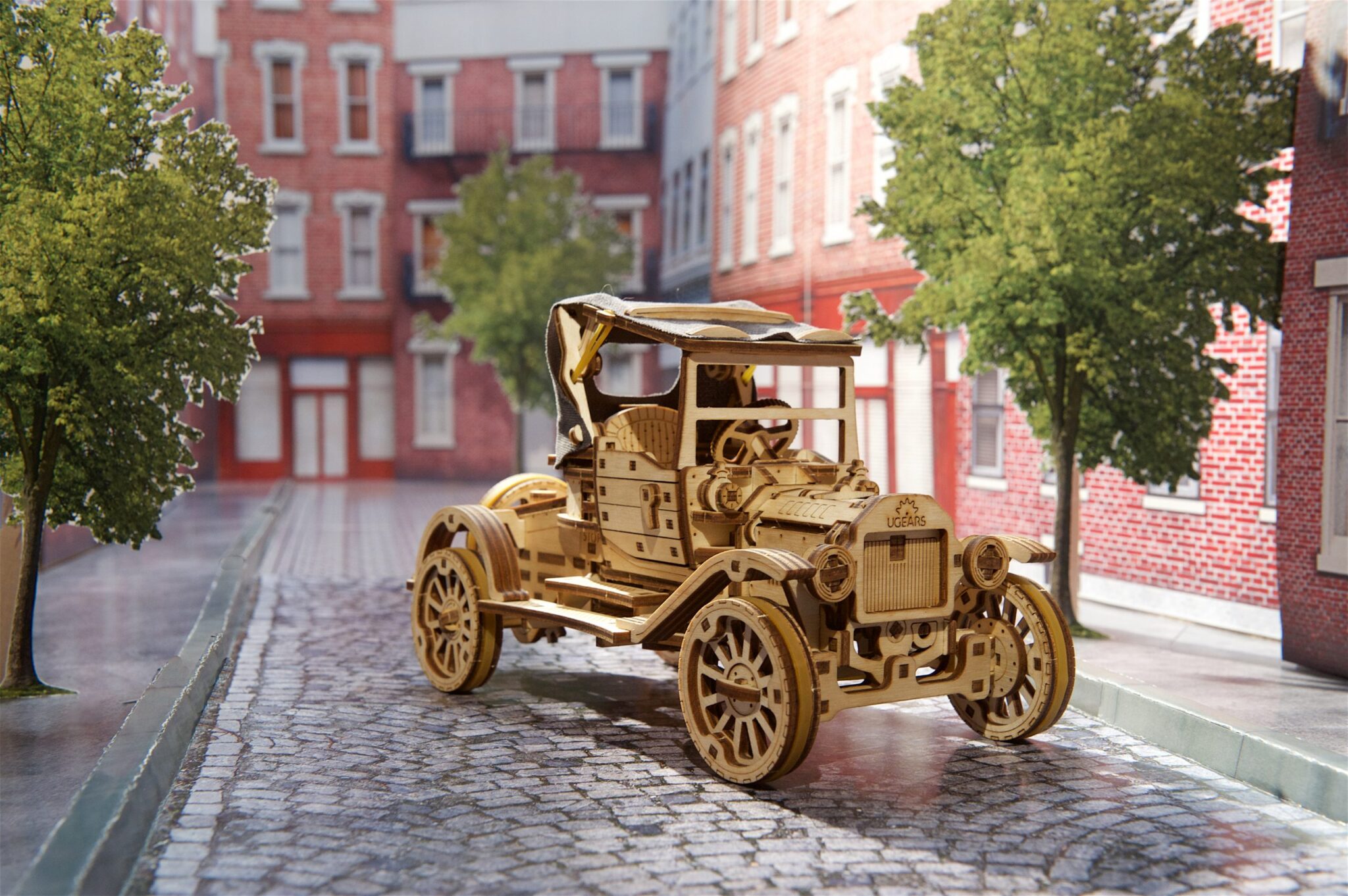 L’équipe d’ingénieurs Ugears a mis au point une maquette de voiture spéciale et classique qui vous ramènera à cette époque. Les caractéristiques exceptionnelles incluent : un toit escamotable avec doublure en tissu, des portières de cabriolet qui se ferme et s’ouvrent vers l’avant, un capot qui s’ouvre de chaque côté pour révéler un moteur 4 cylindres fonctionnel avec manivelle, un pendule skeuomorphique qui simule le son d’un moteur qui gronde, des roues avant qui se tournent à l’aide du volant et une roue de secours à l’arrière. Pour faire fonctionner la Voiture rétro UGR-T, positionnez le bouton « Marche/Arrêt » sur « Arrêt » lorsque vous remontez le moteur à ressort à l’aide du cliquet situé sous le châssis. Placez la maquette sur une surface plate tout en la maintenant d’une main, appuyez sur « Marche » avant de relâcher et la regarder se lancer. La voiture est équipée de modes « Marche avant », « Point mort » et « Marche arrière ».