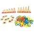 Contenu : 1 socle en bois en 2 parties à assembler avec 10 tiges en bois, 10 pièces en bois avec les chiffres de 1 à 10, 55 anneaux de couleurs (orange, jaune, vert, bleu, rouge).