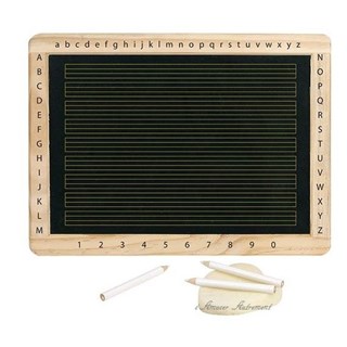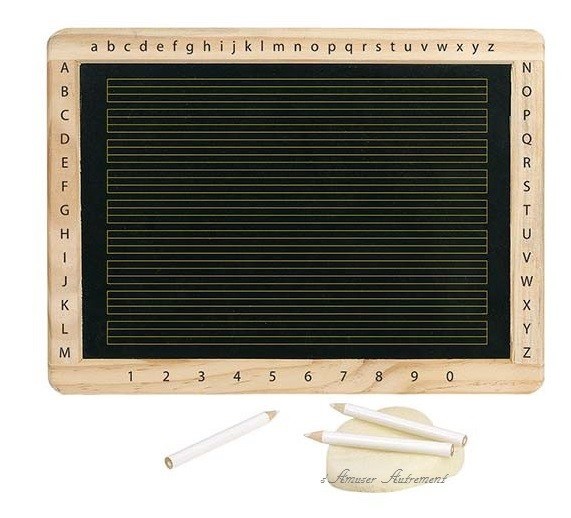 Cette très jolie ardoise en bois est livrée avec une éponge et 3 crayons blanc. Le verso possède des lignes d'écriture discrètement imprimées, l'alphabet en majuscule et minuscule d'imprimerie ainsi que les chiffres de 0 à 9. Le recto est vierge.
