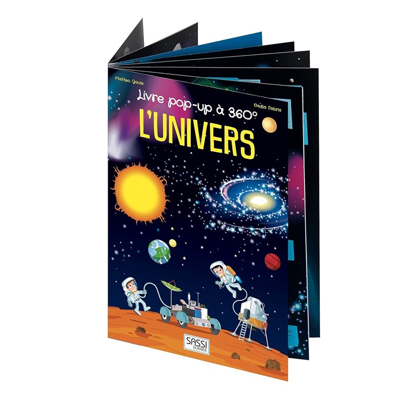 Livre Pop-up sur le thème de l'univers qui s'ouvre à 360°. Quatre zones thématiques pour te faire découvrir les mystères de l’Univers, les planètes du Système solaire, les étoiles, les trous noirs et les galaxies infinies, au-delà des limites du Cosmos ! Tellement de curiosités incroyables et un fantastique pop-up en un seul livre ! A partir de 5 ans.