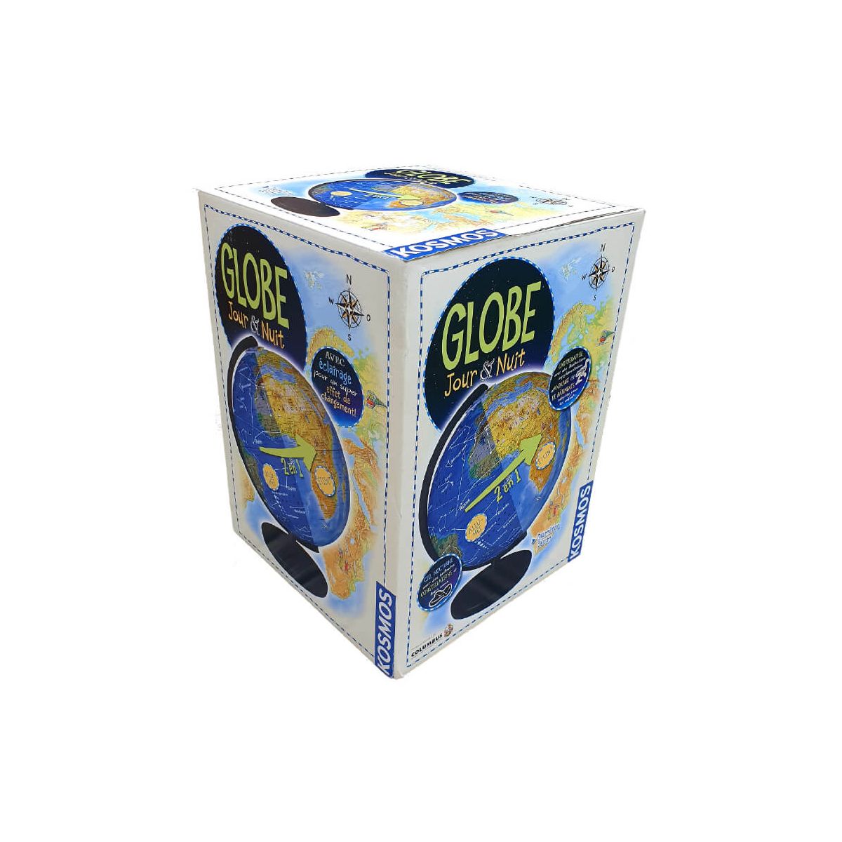 Le globe cosmique jour et nuit de KOSMOS est un globe terrestre innovant pour les enfants qui montre les informations géographiques de la terre et astronomiques du ciel. Avec son éclairage intérieur, le globe offre un effet de contraste surprenant entre la carte de la terre et le ciel étoilé.Caractéristiques du globe jour et nuit Éclairage pour un effet de contraste entre la carte de la terre et le ciel étoilé. Manipulation adaptée aux enfants avec interrupteur marche/arrêt. Images cartographiques actuelles de haute qualité avec illustrations. Développé et fabriqué en Allemagne en coopération avec le célèbre fabricant de globes COLUMBUS. Livret d'accompagnement avec des informations passionnantes sur les superlatifs de la terre, les constellations et les étoiles les plus importantes. Fabriqué en AllemagneComprendre les longitudes et les latitudesLe globe cosmique jour et nuit montre de manière accessible ce que sont réellement des longitudes et des latitudes. Le livret d'accompagnement explique d'où viennent vraiment le jour, la nuit et les saisons, et comment comprendre les étoiles.Un globe, bien plus qu'un jouet décoratifLe globe cosmique jour et nuit est joliment conçu, mais il peut faire beaucoup plus que vous ne le pensez. Il donne aux enfants une image du monde dans lequel ils vivent et du ciel qu'ils regardent. Le globe montre où vivent les éléphants, où se trouve la chute d'eau la plus profonde de la terre et plus encore.Exploration du ciel étoiléLorsque l'éclairage est allumé, le globe diurne devient un globe nocturne ou un globe céleste, montrant les constellations les plus importantes des hémisphères nord et sud ainsi que leur histoire. Le livret d'accompagnement transmet non seulement des connaissances géographiques, mais aussi astronomiques et des compétences d'orientation.Invitation à connaître et comprendre notre mondeLe globe cosmique jour et nuit est une invitation à découvrir et comprendre notre monde. Il répond à des questions sur la terre et le
