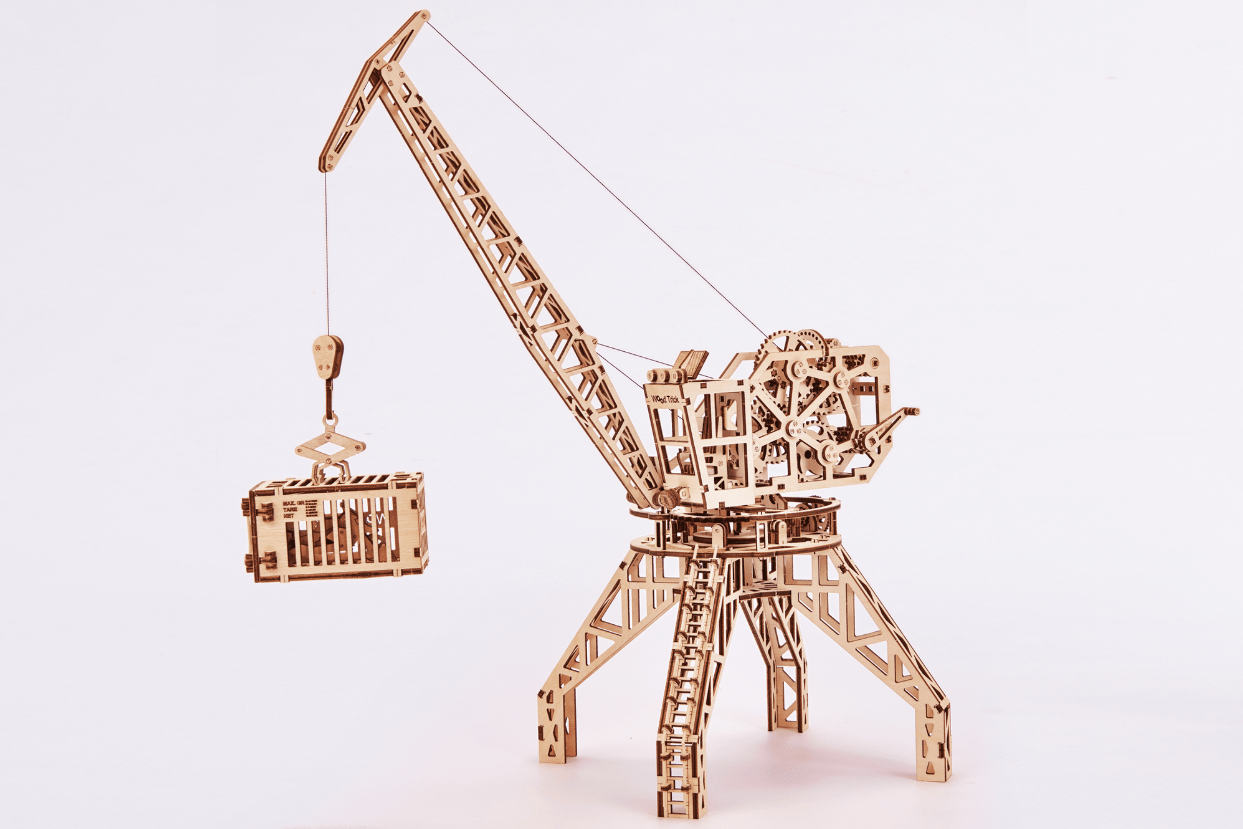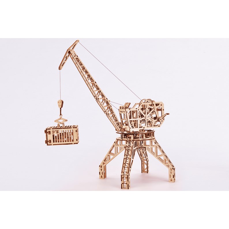 cette maquette en bois est composée de la grue en elle même mais également d'une caisse bois, une petite moto à inclure dans sa caisse.