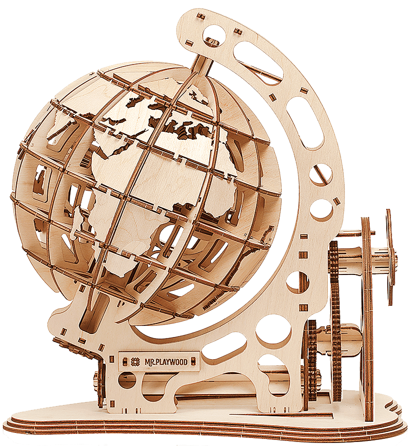 Ce globe est superbe, de forme art déco. Il est vendu sous forme de maquette à assembler, sans colle. Il comprend un système d'engrenage pour faire tourner la terre.