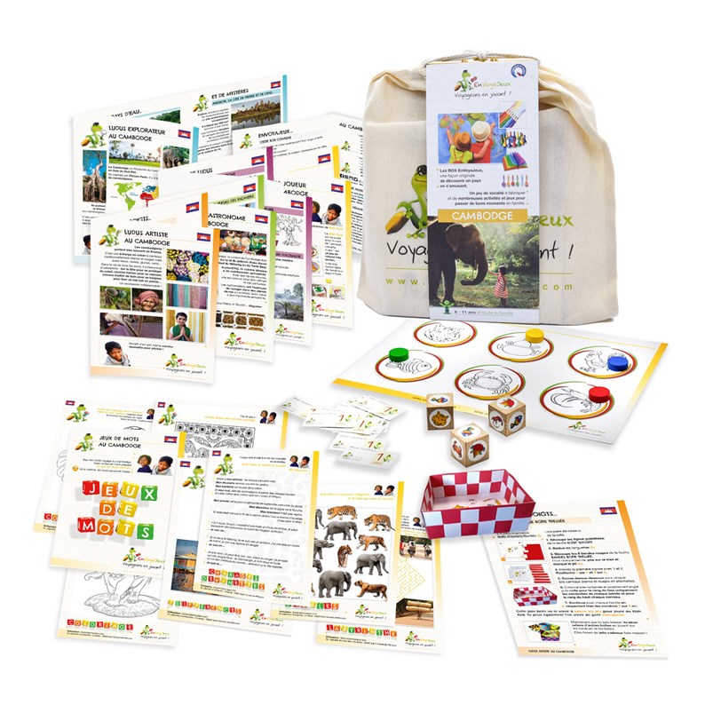 Explorez le Cambodge sans quitter votre salon ! Voyageons en jouant est un VoyaJeux unique, conçu pour éveiller la curiosité des enfants et rassembler la famille autour d’activités créatives, de découvertes culturelles et de jeux traditionnels.