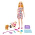 Comprend : une figurine articulée de Barbie avec une robe à fleurs, deux figurines de chiens, un fauteuil roulant, un lit pour les chiens, une brosse et bien plus encore.