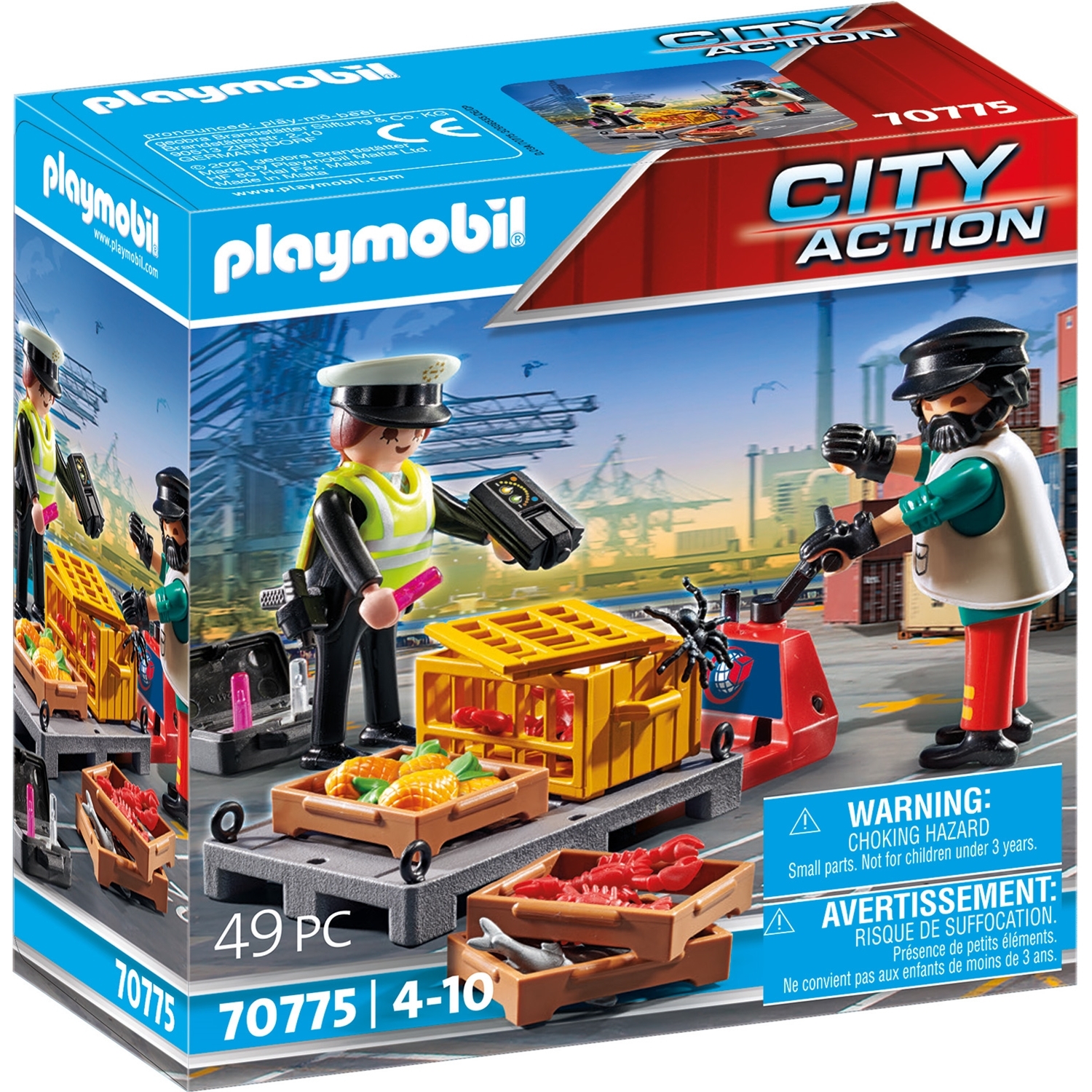 Le port Playmobil déborde d'activités ! Le cargo vient à peine d'arriver que déjà tout le monde se met au travail ! Ce conteneur transportant des denrées alimentaires attire l'œil des douaniers qui décident de le contrôler. Espérons que rien d'anormal ne se cache à l'intérieur !