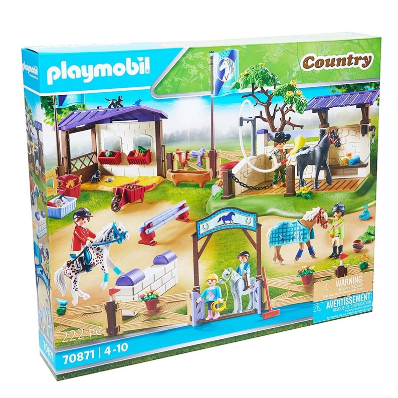 Cet ensemble de 222 pièces de la série Country de Playmobil permet d'organiser des tournois d'équitation et des compétitions équestres authentiques. Une station de lavage est également incluse pour nettoyer les figurines après la compétition.