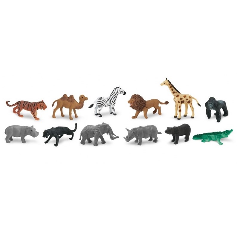 Contient : Girafe, ours brun, tigre, chameau, lion, crocodile, gorille, hippopotame, rhinocéros, zèbre, panthère et éléphant.