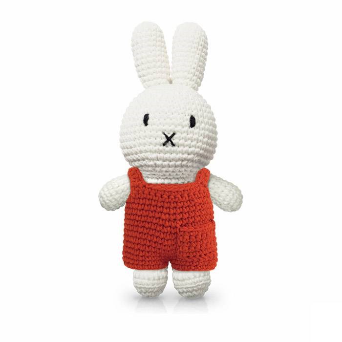 Poupée lapin Miffy tricotée au crochet et habillée de sa salopette rouge au crochet.  En savoir plus