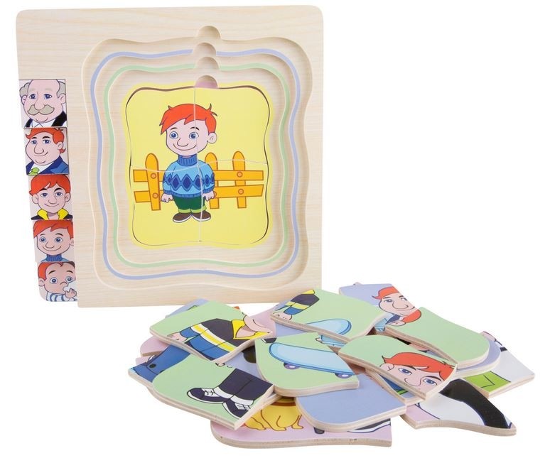 Puzzle en bois multi niveaux, sur le thème du cycle vie de l'homme