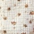 Mia est habillée d’un élégant ensemble en gaze de coton beige : une blouse ample fleuri, une culotte tout doux et un bonet assorti sur la tête.