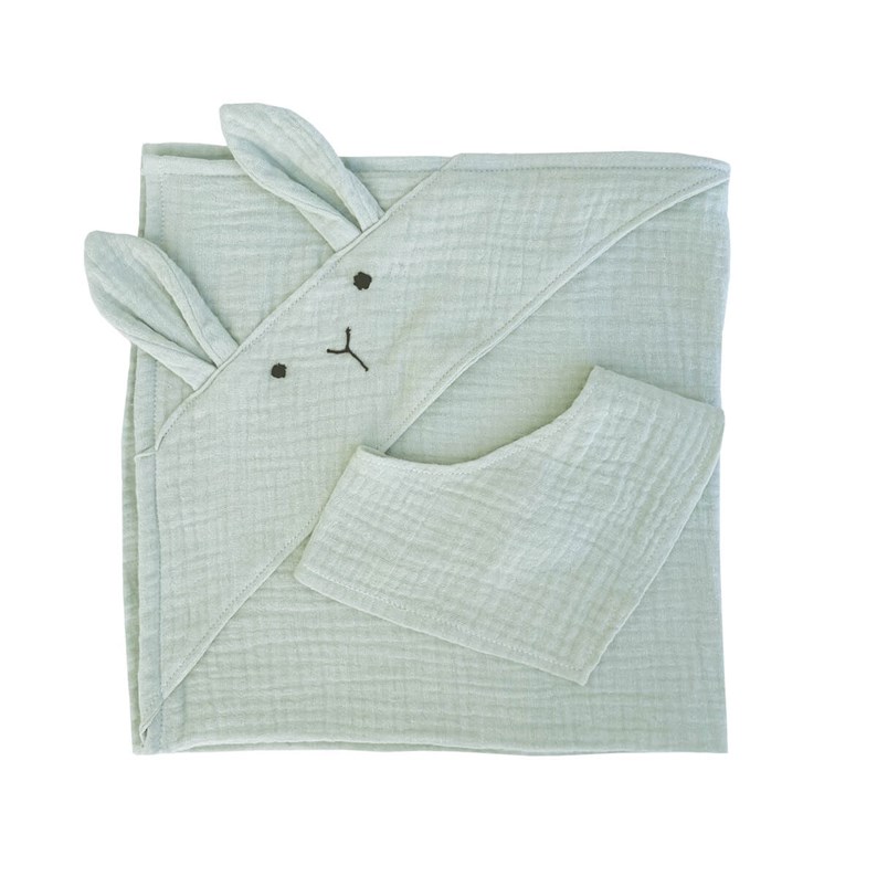 Le set serviette - bandana en coton bio BUNNY BOBBLE vert est le kit indispensable pour le bain !
