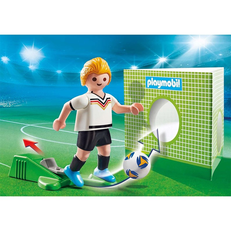 Tir et but avec les stars du football PLAYMOBIL. Naturellement, toutes les nations participantes veulent gagner le match, le joueur national allemand est lui aussi très motivé et fonce droit vers le but. Qui finira par remporter le trophée* La fonction de tir à une main pratique permet de placer à la fois des ballons plats et hauts. Remporte le match avec le joueur national d'Allemagne. La combinaison avec l'arène de football (réf. 70244) promet encore plus de moments de football passionnants. Les étiquettes de noms vierges jointes permettent d'inscrire individuellement le nom de son joueur préféré sur le personnage.