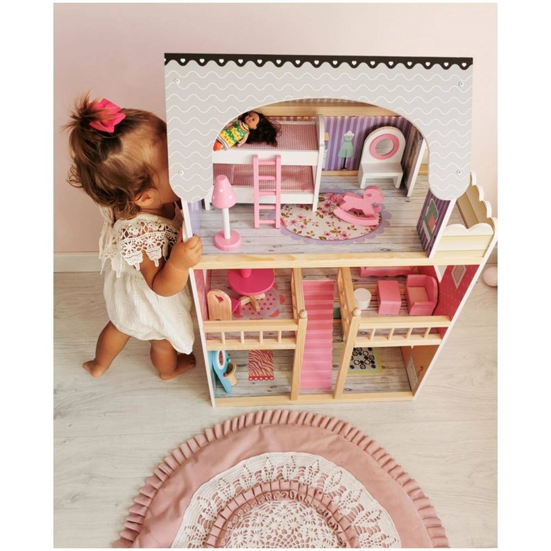 Cette belle maison de poupée en bois de trois étages & terrasse est entièrement équipée et dispose de grandes pièces spacieuses dans lesquelles de beaux meubles et accessoires en bois peuvent être réarrangés.