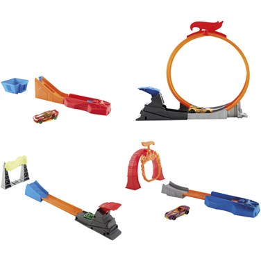 Collectionnez les 4 coffrets cascades pour plus d'action, de sauts et de loopings avec la Tour Electrique, l'Anneau de Flammes, le Défi Looping et le Défi Cascades.