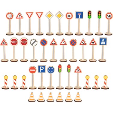 Ce set de panneaux de signalisation se compose de 40 panneaux, permettant d’équiper le réseau routier d’une ville entière. Les panneaux et leurs socles sont fabriqués en contreplaqué.