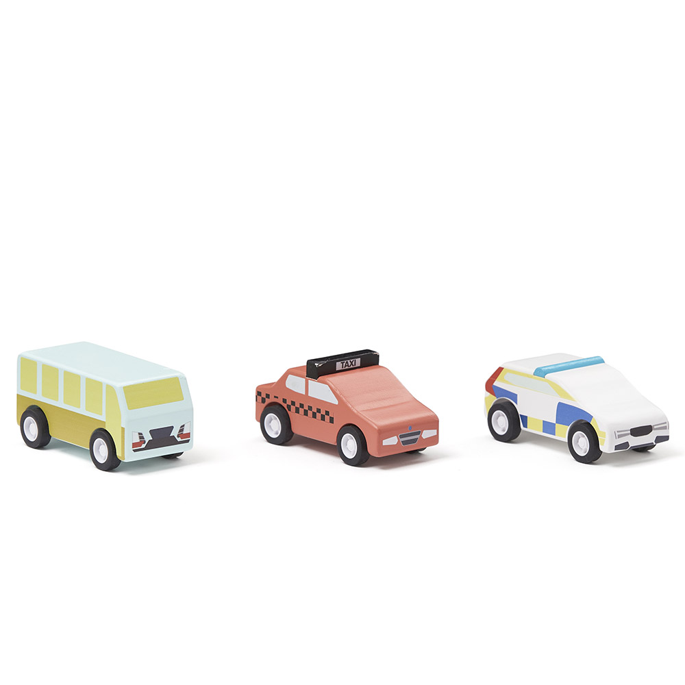 Un lot de trois modèles de véhicules différents. Un bus, un taxi et une voiture de police.