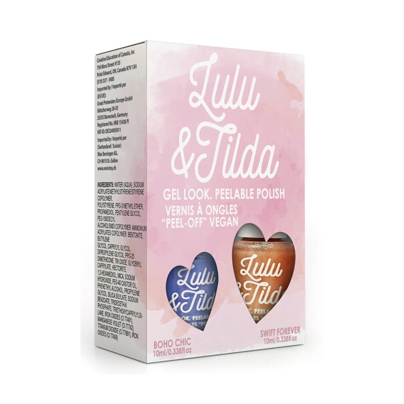 Découvrez Lula et Tilda de Great Pretenders, notre dernière innovation en matière de mode pour les ongles : une gamme de vernis à ongles pelables pour enfants qui séduisent par leur fini gel et leur couvrance facile en une seule couche ! Fabriquée en Italie, cette gamme offre à tous un moyen sûr et élégant d'exprimer leur style personnel ! Nos vernis à ongles Lula et Tilda sont soigneusement formulés pour être totalement non toxiques et vegan. Leur conception pelable facilite leur retrait : il suffit de décoller le vernis lorsque vous êtes prêt à changer, sans solvant ni dissolvant. Chaque flacon offre une couverture éclatante et complète qui attire le regard grâce à son aspect brillant et gel. La formule à séchage rapide vous permet de passer moins de temps à attendre et plus de temps à montrer vos beaux ongles aux couleurs vives. Que ce soit pour vous habiller pour une occasion spéciale ou pour ajouter une touche de couleur à vos tenues de tous les jours, nos vernis à ongles Lula and Tilda apportent une touche de fantaisie et d'élégance.