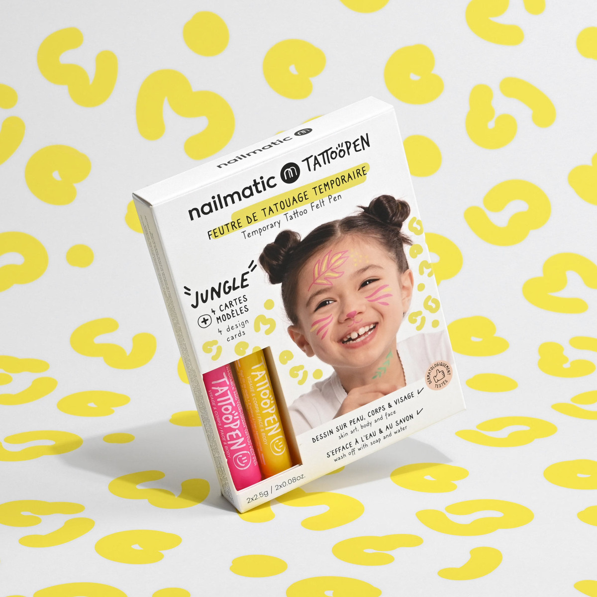 Le coffret Tattoopen (feutres de tatouages temporaires) jungle ? Un kit complet pour expérimenter le dessin sur peau en étant guidé pour faire ses premiers pas.