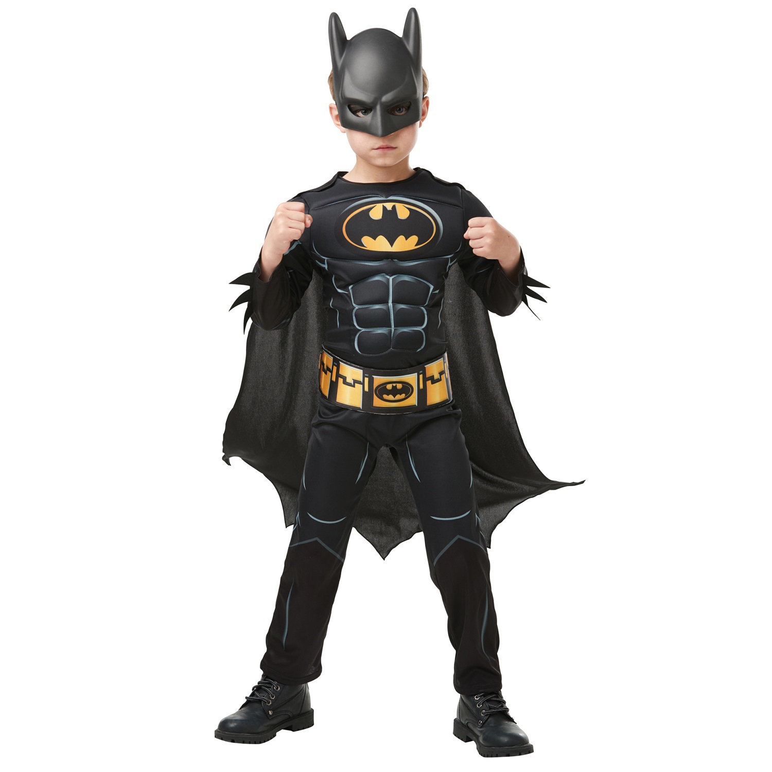 Ce déguisement pour enfant comprend comprend une combinaison à manches longues en jersey imprimée noire et jaune avec muscles rembourrés, une ceinture en tissu et mousse, une cape avec attaches scratch sur les épaules et un masque PVC noir à l’effigie de Batman avec attache élastique à l’arrière. Votre enfant se sentira comme un vrai super-héros !