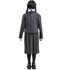 L'uniforme scolaire de Mercredi Addams est fidèlement reproduit avec l'écusson représentant l'école et les bandes verticales noires et grises. Le col blanc et les manches confèrent un côté rétro chic au vêtement. La tenue est idéale pour un cosplay réussi de la pensionnaire de la Nevermore Academy lors d'une soirée à thème ou Halloween...